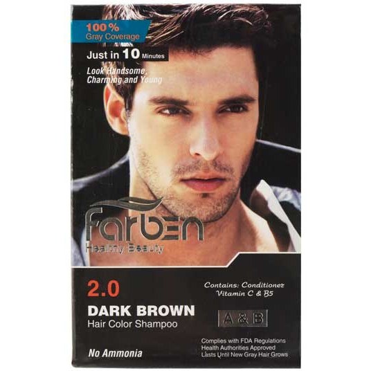 شامپو رنگ موی مردانه قهوه ای تیره فاربن در ده دقیقه رنگی قهوه ای تیره و طبیعی به موهای شما می بخشد. ماندگاری رنگ این محصول تا ۱۸ بار شستشو است.